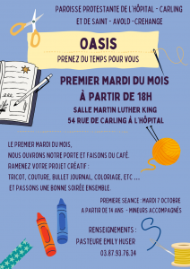 Mardi 4 novembre à 18h à la paroisse de L’Hôpital : « Loasis ». Temps de rencontre et de partage autour d’une tasse de café. Pas de thème particulier, juste le plaisir d’échanger avec son voisin ! Vous pouvez aussi apporter votre tricot, votre coloriage……