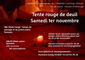 Samedi 1er novembre à 18h à la paroisse de L’Hôpital : Tente rouge. Il s’agit d’une rencontre de femmes et d’un partage autour d’un thème différent à chaque fois, Cette fois-ci, nous parlerons du deuil.